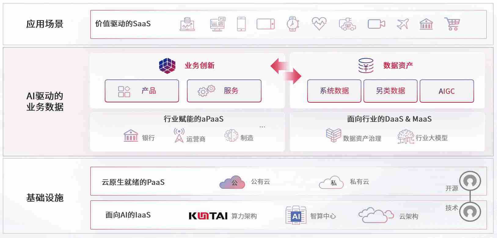 数字时代,,,,围绕企业数字化转型的关键要素,,Z6尊龙数码开创性的提出数云融合战略和技术体系框架,,着力在云原生、、数字原生、、、AI原生和信创产业上架构产品和服务能力,,,为处在不同数字化转型阶段的快消零售、、汽车、、、金融、、、医疗、、、政企、、、教育、、、运营商等行业客户提供泛在的敏捷IT能力和融合的数据驱动能力,,,构建跨界融合创新的数字业务场景和新业务模式,,助力企业级客户建立面向未来的核心能力和竞争优势,,,,全面推动社会的数字化、、、智能化转型升级。。。。